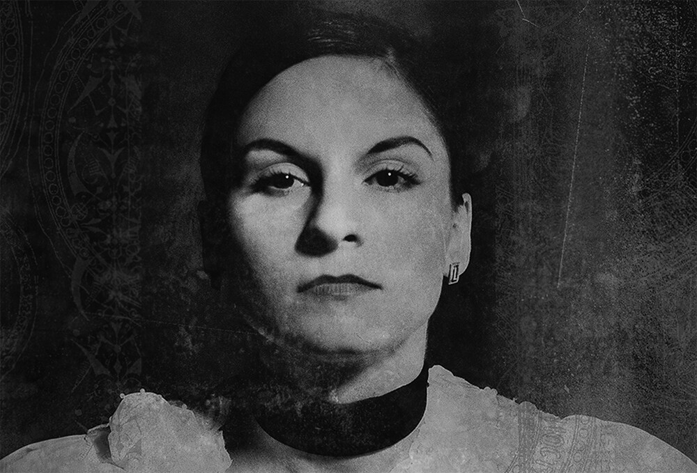 Emerging from still water, only her face visible — a woman’s quiet power and mystery captured in a single, contemplative frame.